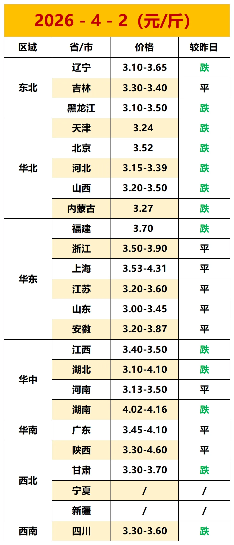 蛋价日评:今日鸡蛋价格下跌。产蛋鸡存栏处于高位,换羽鸡陆续开产致供给偏宽松。清明备货进入尾声,终端接货意愿下降。假期后需求疲软,预计蛋价将维持偏弱运行。