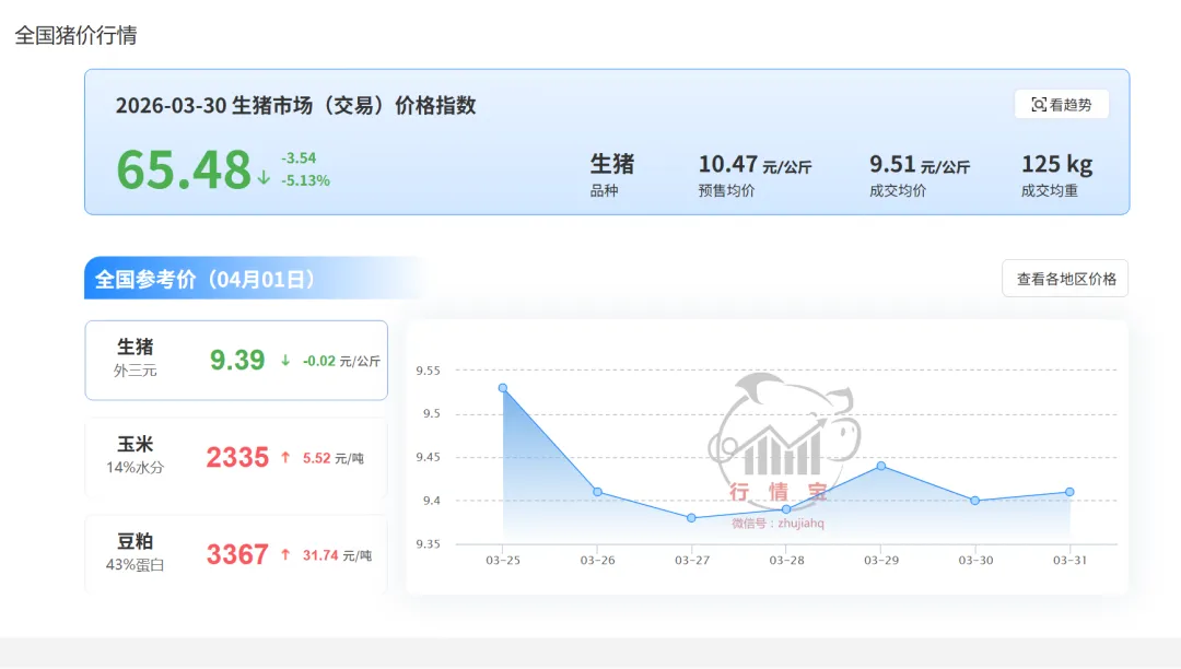 3月30日,“国家生猪市场”交易价格指数显示,当日全国生猪成交均价为9.51元每公斤,跌破5元每斤,创近10年历史新低,目前价格仍持续低迷。