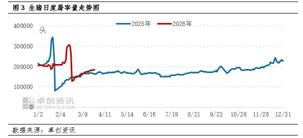 在大猪积压的形势下,业内寄希望于终端需求的宰量上涨推动大猪消化。据卓创资讯监测显示,截至3月27日,样本企业日度屠宰量为185302头,较3月初增加32501头,增幅较2025年同期增加20595头。也在近五年的同期对比中,增幅最明显。得益于猪价跌至成本线下后,部分屠企开启冻品入库动作。但猪价长期低位难涨,屠宰端更倾向于小幅度入库,入库比例控制在30%以下而并未大规模入库。