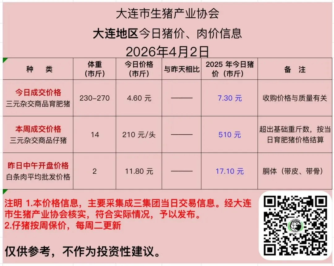2026 年 4 月 2 日猪价、肉价信息 养羊网 2026-04-02 2026 年 4 月 2 日猪价、肉价信息天天报价大连市生猪产业协会 养羊网 2026-04-02 上一篇:今日猪价(2026.04.02) 下一篇:4月2日猪价 | 市场再次走弱,有大猪的要警惕! 您可能还会对下面的文章感兴趣111: 相关文章 【明日猪价】1月22日(跌猛了,猪价下跌“猛抬头”!全国猪价最新报价) 近期价格更新!!! 我羊舍的人形! 2025年2月猪价走势大揭秘