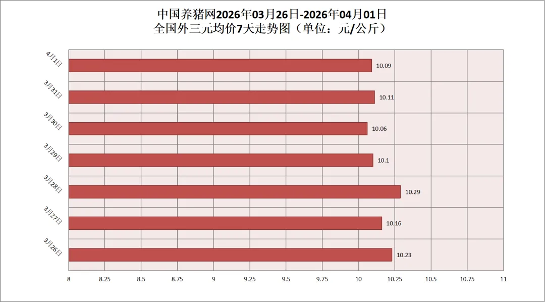 2026年04月01日(星期三),据中国养猪网猪价系统监测,全国外三元均价为10.09元/公斤,猪价较昨日(10.11元/公斤)下跌0.02元/公斤,较上月(11.35元/公斤)下跌了1.26元/公斤。