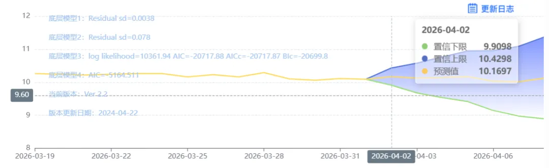 玄田算法是由项目课题组团队原创的非经典逻辑数值聚合理论和不确定性预测方法,构建了基于一致模算子的生猪价格预测模型。该模型采用的聚合函数及一致模相关理论与方法已获得多项国家自然科学基金和省级自然科学资金资助,并获得多项省级自然科学奖奖项。04月02日预测猪价为10.1697,置信区间在9.9098--10.4298之间。04月03日预测猪价为10.1238;04月04日预测猪价为10.1423。