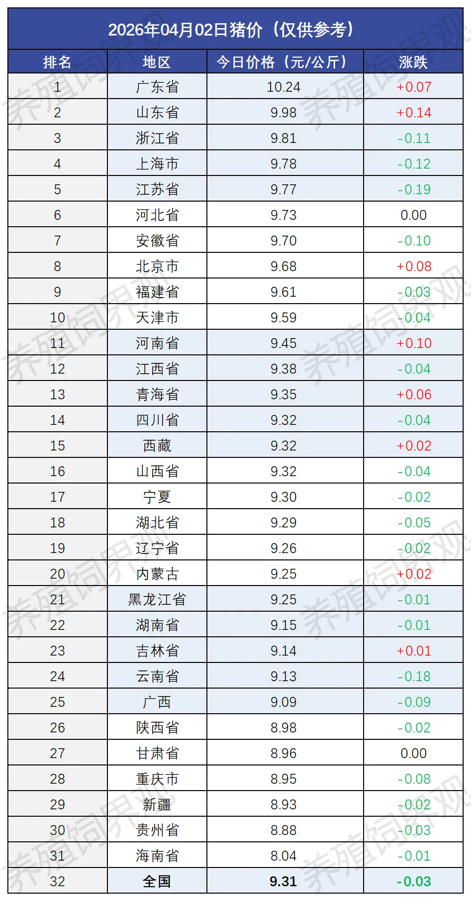 目前全国最高价为广东省,价格为10.24元/公斤,较昨日上涨0.07元/公斤;全国最低价为海南省,价格为8.04元/公斤,较昨日下跌0.01元/公斤。