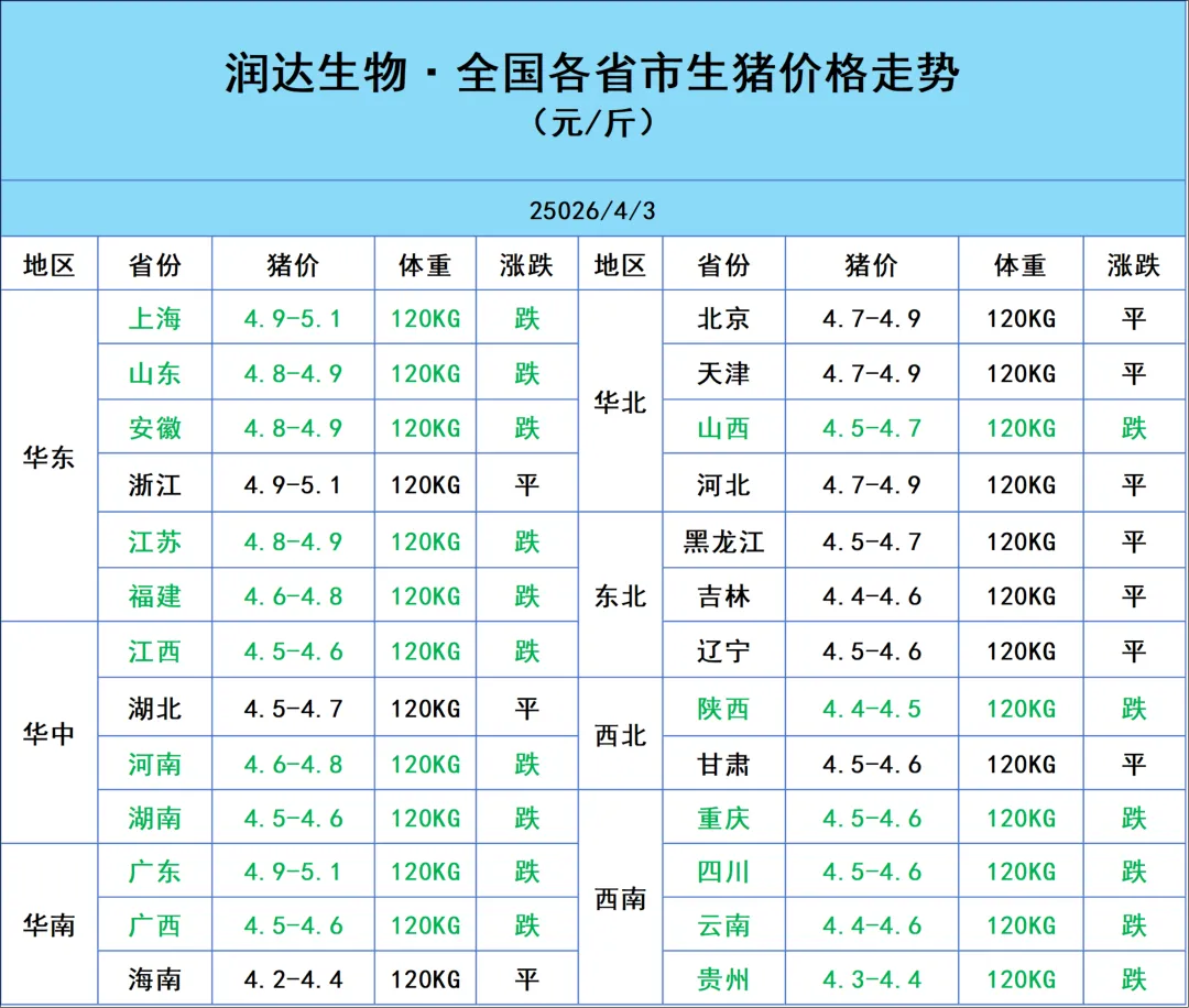2026年4月3日明日猪价行情:北方企稳,南方大面积下跌! 养羊网 2026-04-02 2026年4月3日明日猪价行情:北方企稳,南方大面积下跌!免责申明:本微信服务平台资料来源于网络收集,以供给大家学习、交流为目的,请诸位在阅读后,尽快删除,尊重资料原作者,支持正版。若所列资源侵犯了您的权益请直接留言,立刻删除! 养羊网 2026-04-02 上一篇:猪价早知道20260402持续低谷 下一篇:涨!全国各地2026.4.3猪价(已更新) 您可能还会对下面的文章感兴趣111: 相关文章 问一下 ??鸡蛋为啥这么贵啊 这里鸡蛋价格真香!?繁荣超市开业专属价 2025年4月13日全国各地生猪价格信息