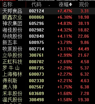 4月1日,猪肉板块盘中震荡上涨,截至发稿,天邦食品涨超7%,顺鑫农业涨超6%,神农集团、湘佳股份、华统股份等涨幅居前。