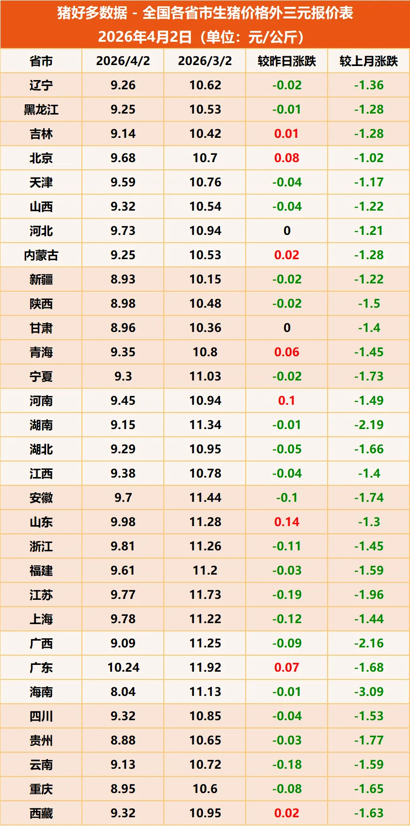 其中各个地区的情况也有分化表现:河南猪企出栏增量但价格坚挺,大小标猪统一站稳9.6元,小体重标猪至9.65元、大体重9.55元;广东挂牌价维持10.6元,区域强势不改;其余地区以稳为主,仅0.05-0.1元小幅波动,低价区出现补涨。