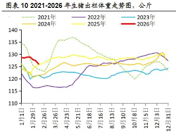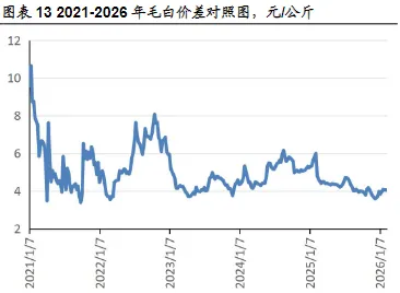 4)2025年以来,毛白价差明显低于2021-2022年同期、2024年同期,与2023年同期基本持平,终端需求疲弱。2026年春节前毛白价差仅4.07元/公斤,明显低于2021-2025年春节前毛白价差。