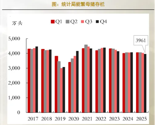 本次会议进一步压实企业的产能调控责任,生猪产能调控政策明显趋严。2025年12月末全国能繁母猪存栏量3961万头,若产能下调至3650万头,下降幅度将达到7.9%,将为本轮猪价上涨周期奠定坚实基础。