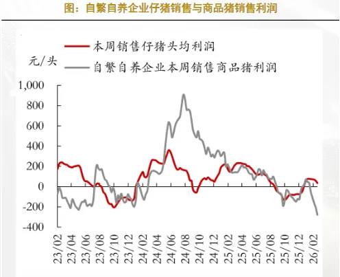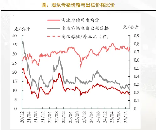 结合能繁母猪与商品猪的比价来看,2025年比价同比降幅显著,表明市场淘汰母猪的意愿较2024年明显增强。2026年初养殖利润回暖,淘汰进程放缓;近期伴随现货超跌,淘汰加速,母猪淘汰价格继续下滑,3月淘汰母猪出栏量或较高概率呈现明显的环比增长态势。