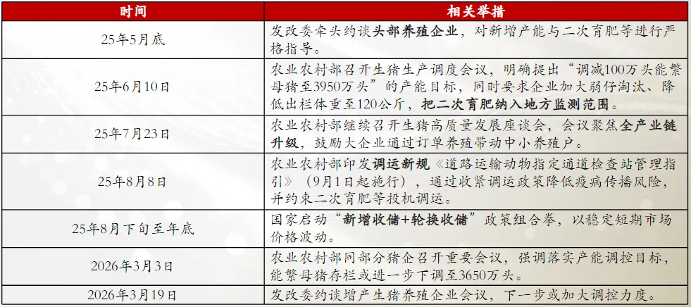 2026年中央一号文件《中共中央国务院关于锚定农业农村现代化、扎实推进乡村全面振兴的意见》再次强调“强化生猪产能综合调控”。随后,农业农村部在配套实施意见中提出“强化生猪产能综合调控,对头部生猪养殖企业实行年度生产备案管理,有序调控全国能繁母猪存栏量,促进市场供需更加适配”。