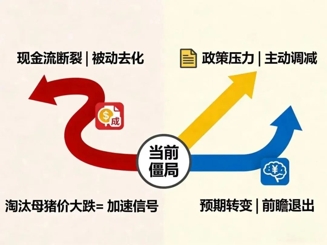 这是最残酷但最有效的路径。如果亏损持续时间远超市场预期,部分养殖主体的现金流最终将被耗尽。届时,将出现不计成本的抛售,淘汰母猪价格将大幅补跌,产能实现快速、被动出清。当前的政策正是在与时间赛跑,避免行业陷入更长期、更惨烈的全面消耗战。