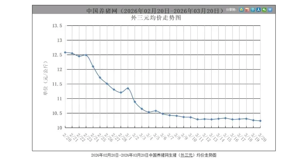 2026年3月23日,全国生猪均价跌破每公斤十块钱。换算成斤,不到五块。这是近十五年的最低点,比2018年那场行业大萧条还要低。从2025年7月开始,整个行业连亏八个月,整整三十四周,没人赚到钱。