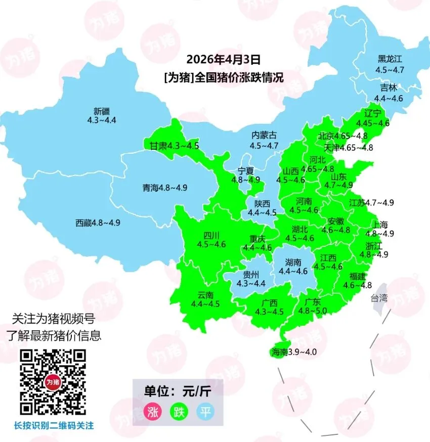 今日全国生猪收购均价呈现下跌态势,全国外三元标猪均价4.57元/斤,环比昨天下跌0.04元/斤,上涨地区0个,下跌地区21个,稳定地区7个,全国生猪收购最低价为海南,价格为3.9元/斤,最高价为广东,价格为5.0元/斤。 今日全国猪价继续磨底,东北地区的中大猪价格下调3-5毛,散户中大猪出栏增加,今日河南一哥出栏价格下调1毛,小体重标猪9块5,大体重在9块4,广东大场挂牌价格下调1毛,价格5块2,近期猪企出栏有增量,散户300-350斤大猪出栏也在增加,市场继续弱势,警惕 标肥倒挂现象,各位养猪老板们,你们那边300斤左右大猪出栏什么价格?欢迎大家在评论区留言。 养好猪,才有钱赚!
