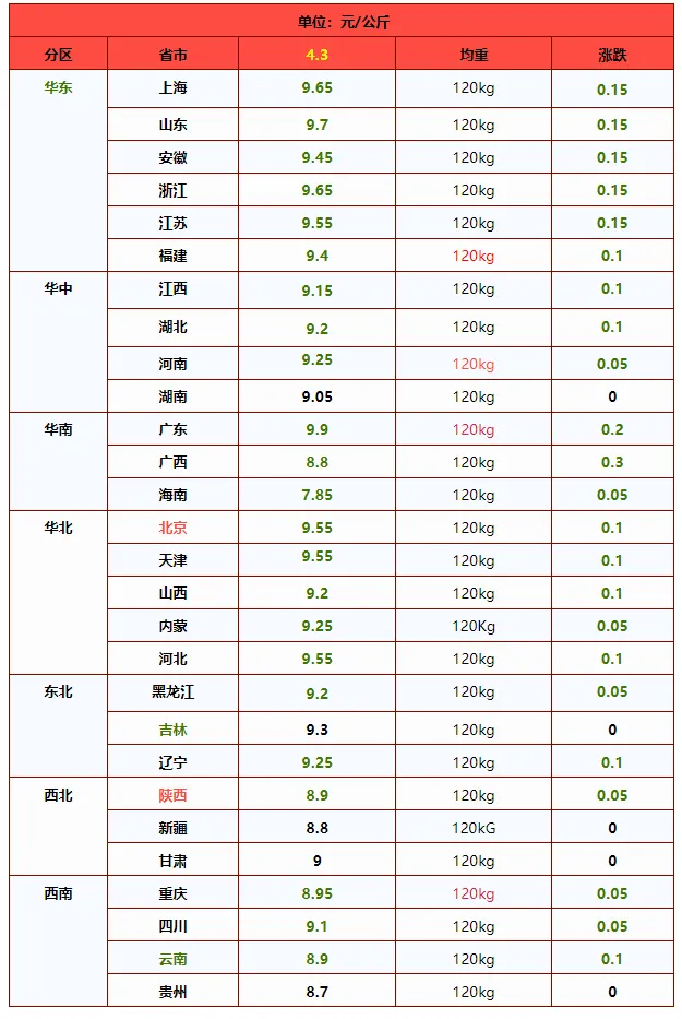 根据屠宰场的最新调价,预计4月3日,外三元瘦肉型标猪出栏均价在9.15元/公斤左右。