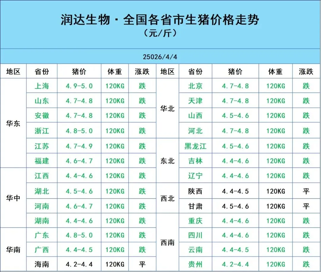 2026年4月4日明日猪价行情:疯狂下跌! 养羊网 2026-04-03 2026年4月4日明日猪价行情:疯狂下跌!免责申明:本微信服务平台资料来源于网络收集,以供给大家学习、交流为目的,请诸位在阅读后,尽快删除,尊重资料原作者,支持正版。若所列资源侵犯了您的权益请直接留言,立刻删除! 养羊网 2026-04-03 上一篇:涨!全国各地2026.4.4猪价(已更新) 下一篇:4月3日鸡蛋价格稳 您可能还会对下面的文章感兴趣111: 相关文章 2025年4月13日全国各地生猪价格信息 吐槽 春节前后猪价会跌破5元吗? 中国养猪网消息