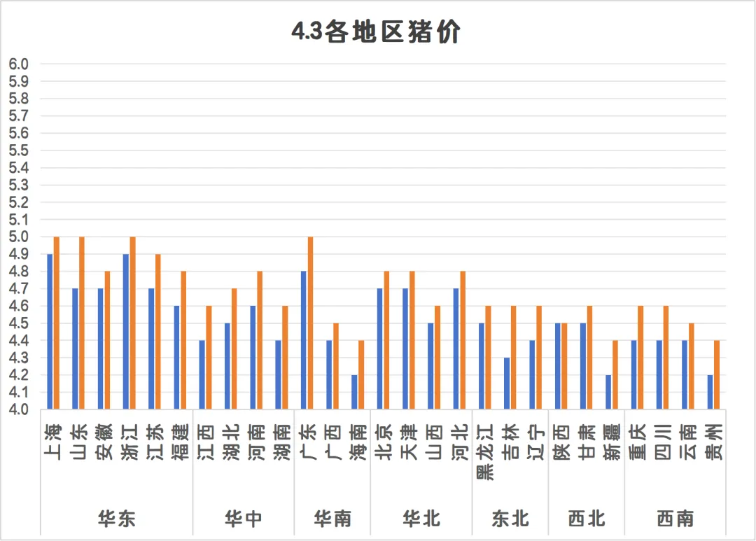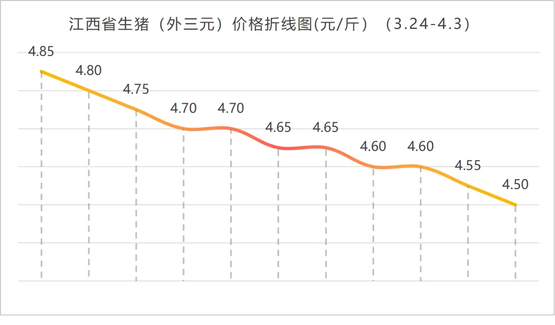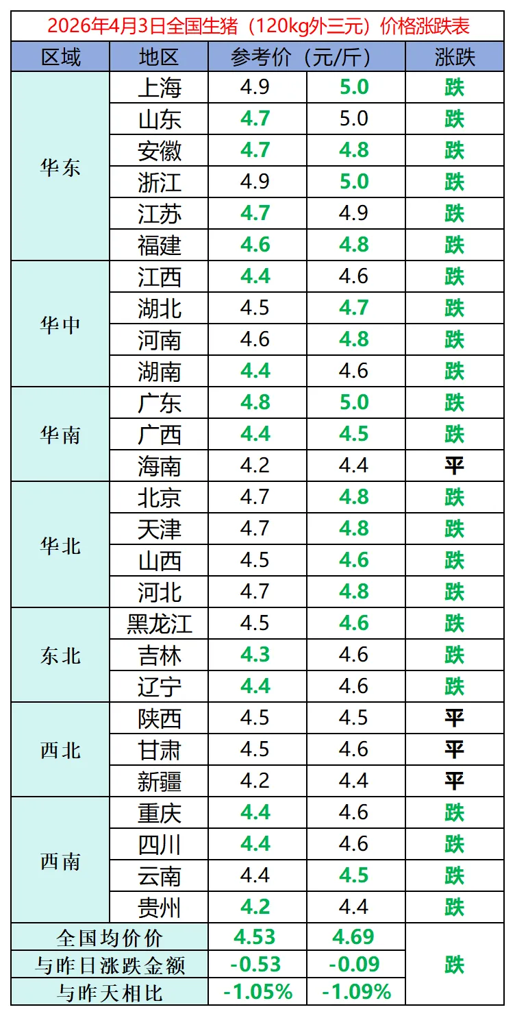 ? ? ? 4月3日,清明小长假前夕,国内生猪市场却感受不到丝毫暖意。今日全国外三元标猪出栏均价进一步下探至9.15-9.26元/公斤,多地实际成交价已逼近4.5元/斤关口,猪价正在向市场公认的“地板线”靠近。从区域表现来看,南北价差持续收窄,广东以4.8-5.0元/斤的相对高位领跑全国,而贵州、新疆等低价区已跌破4.4元/斤,贵州均价低至8.54元/公斤,全国猪价洼地与高点之间的价差已不足1.5元/公斤,反映出猪源跨区域流通顺畅、供应整体充裕的基本面。