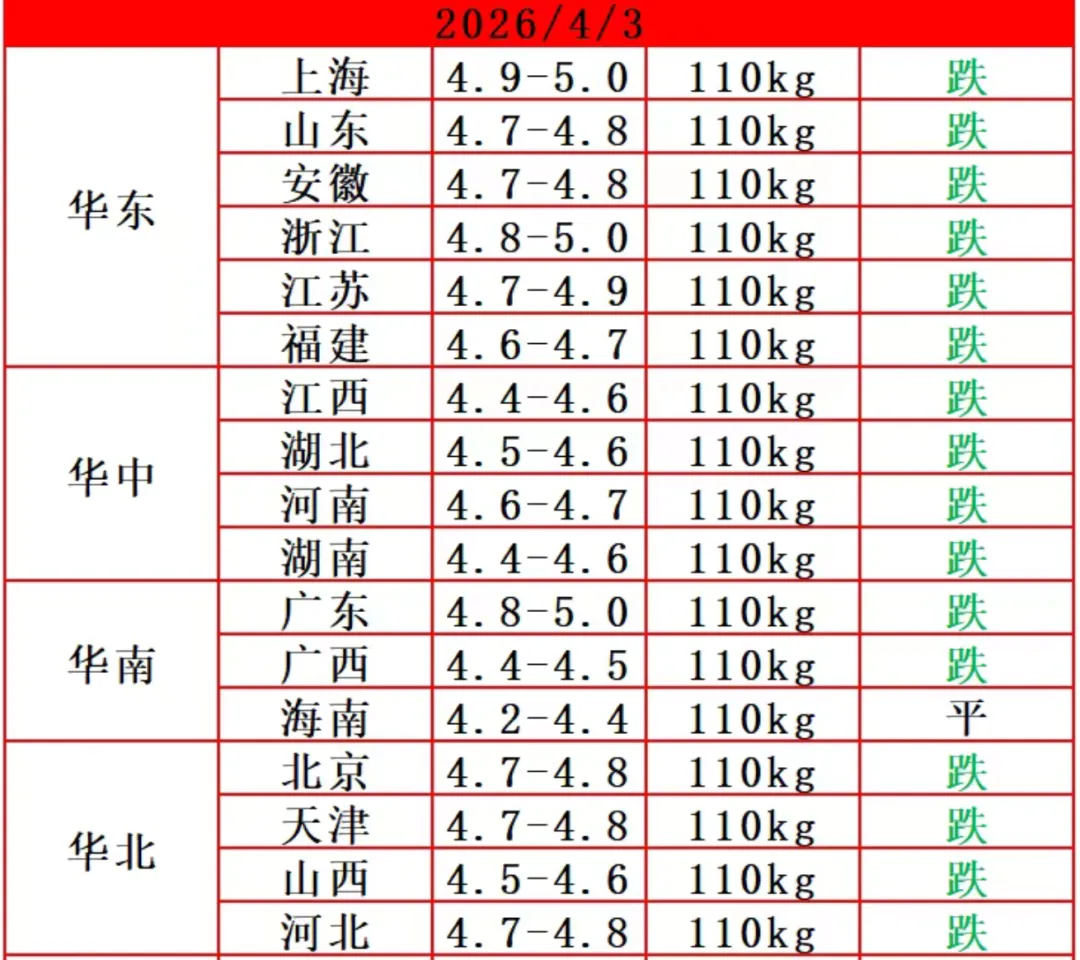 2026.4.3 最新生猪价格,今日猪价 养羊网 2026-04-03 2026.4.3 最新生猪价格,今日猪价 养羊网 2026-04-03 上一篇:2026年4月3日正大湖南鸡蛋价格行情 下一篇:【明德牧业】4月3日鸡蛋价格早报 您可能还会对下面的文章感兴趣111: 相关文章 三十几块钱的腊肉你们问都不问一下的吗? 梦想城镇|14万人看过的!畜牧+土地布局整合 2025年4月13日全国各地生猪价格信息 2026年1月17日东莞信立鸡蛋价格早报