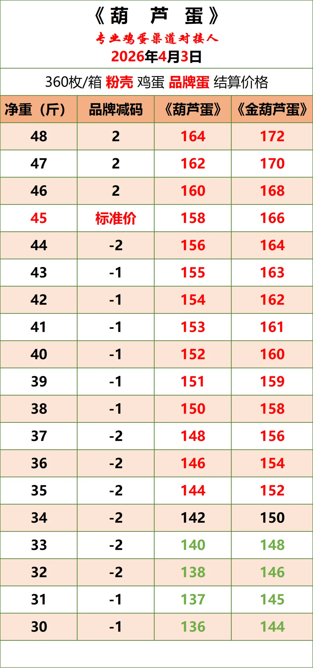 4、养殖场、贸易商日产量150件以上,可大车(至少6.8一车)直发的,支付合理信息维护服务费后,可按以上成交价格对接渠道,详情可来电约谈。