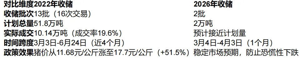 将2026年收储与历史上最大规模的2022年收储进行对比,可以发现政策调控思路的演变: