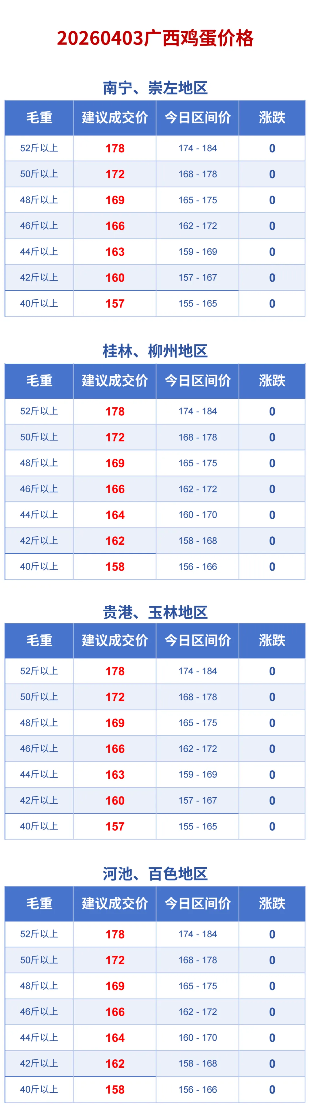 说明:广西鸡蛋价格发布,是为深入落实农业农村部《“百场(厂)千村万户”畜禽生产和效益定点监测信息采集》工作要求的基础上,健全广西蛋禽产业数据监测体系,提供实时精准的鸡蛋价格锚点,推动行业形成透明规范、公允合理的价格体系,助力我区蛋禽产业高质量发展。