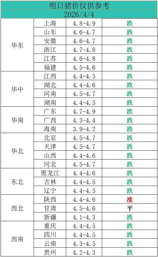 2026年4月4日全国猪价信息/供大家参考 养羊网 2026-04-03 2026年4月4日全国猪价信息/供大家参考 养羊网 2026-04-03 上一篇:【明天猪价】 2026. 4.4号 明天猪价早知道! 下一篇:【明天猪价】 2026. 04. 04 全国猪价! 您可能还会对下面的文章感兴趣111: 相关文章 明日猪价(2月11日) 2026.1.26-明天猪价(全国各地生猪报价) 鸡蛋行情 你们那的羊肉多少钱!