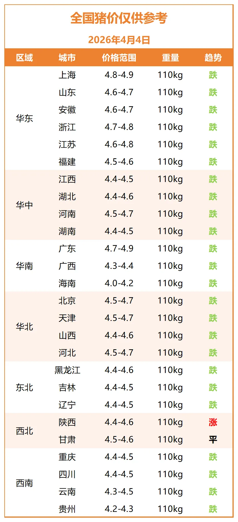 明日猪价早知道~全国绝大部分地区猪价下跌,仅有甘肃的猪价持平,陕西的在上涨!