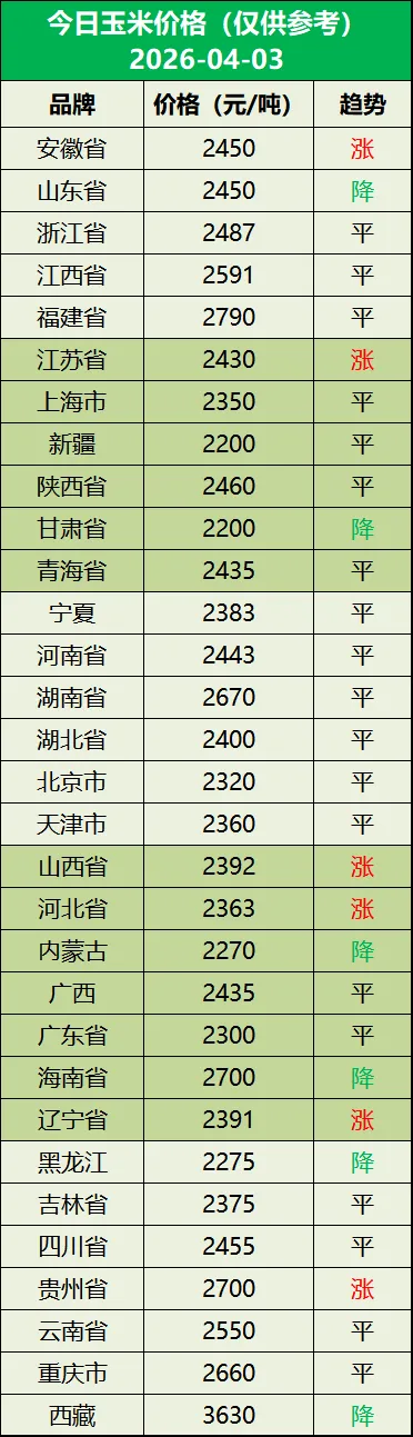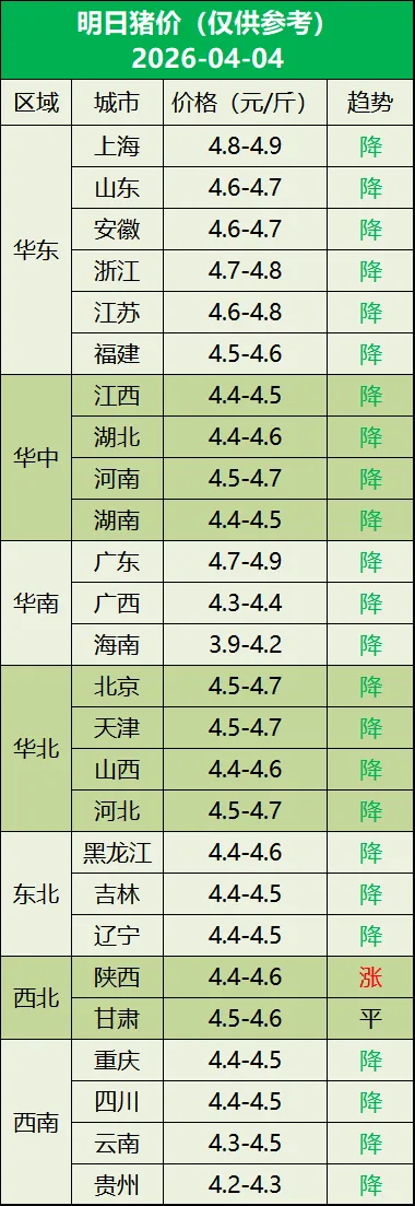 明日猪价(2026年04月04日) 养羊网 2026-04-03 明日猪价(2026年04月04日) 养羊网 2026-04-03 上一篇:04.04明日猪价早知道,04.04全国最新猪价信息,跌!跌!跌! 下一篇:明日最新猪价2026.04.04——中央收储冻猪肉 1万吨,能否救市? 您可能还会对下面的文章感兴趣111: 相关文章 【明天猪价】2026.2.28全国猪价(已更新!) 2026年3月21日 川渝鸡蛋价格参考!涨 鸡蛋裸空改反套 贵州百顺集团鸡蛋价格:2月15日;暂停报价,专心过年!??感谢一路支持,不负每份信任.祝大