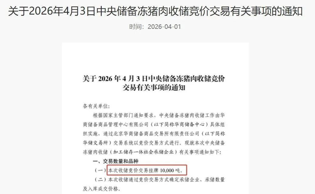 4月1日,华储网发布《关于2026年4月3日中央储备冻猪肉收储竞价交易有关事项的通知》,本次收储挂牌竞价交易1万吨。
