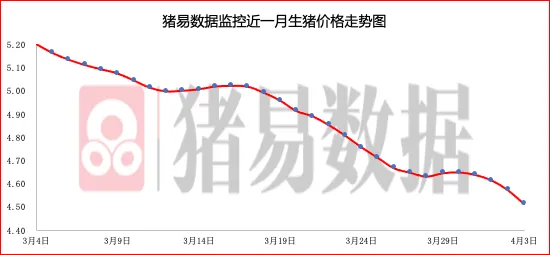 据猪易数据监测数据显示,2026年4月03日标准体重生猪平均价格为9.03元/公斤,较昨日猪价下跌0.12元/公斤,跌幅1.31%,同比25年同期14.57元/公斤下跌5.54元/公斤,跌幅38.02%。