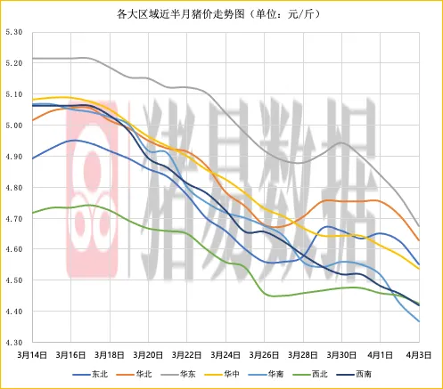 东北、西北、华北、华中、华东、西南、华南地区猪价呈现下跌,生猪平均价格小幅下跌。