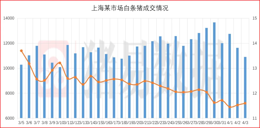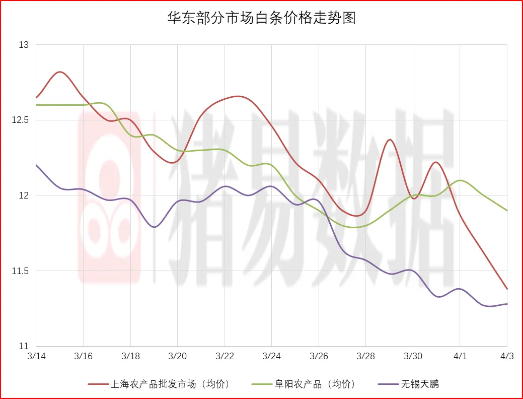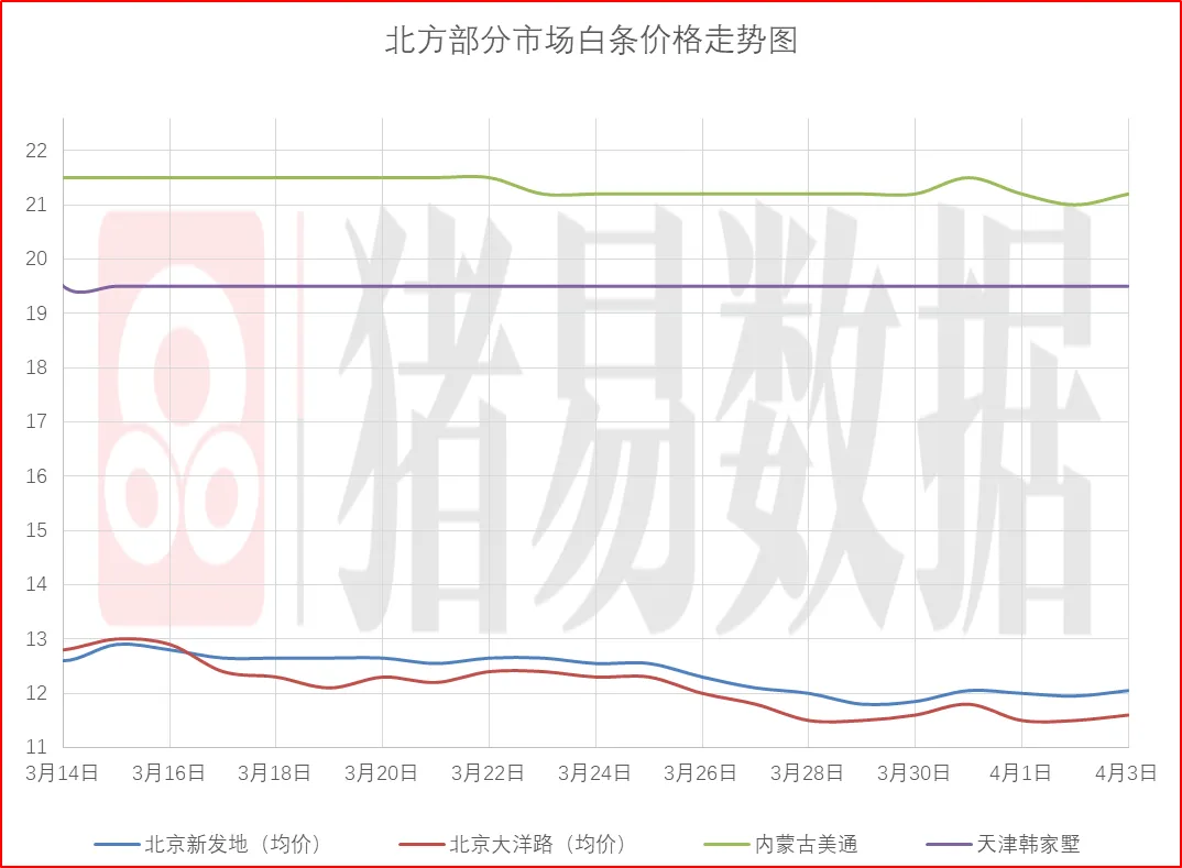 从今日北京、上海消费城市批发市场白条价格走势来看,北京、上海批发市场白条开磅价格呈现跌涨调整,北京大部分市场开磅价格维持稳定,市场走货速度表现一般偏好;上海市场价格呈现跌涨调整,部分市场成交价参考11.38-11.6元/公斤,到货量表现有所减少,市场交易情况表现一般,市场成交均价表现一般。