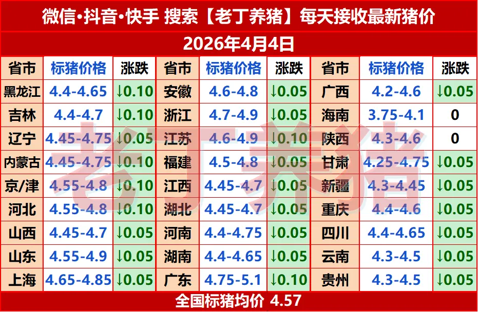 猪价来了!【明天猪价】4月4日全国猪价涨跌表! 养羊网 2026-04-03 猪价来了!【明天猪价】4月4日全国猪价涨跌表! 养羊网 2026-04-03 上一篇:猪价呈现稳中偏弱,猪价下行压力仍在 下一篇:2026.4.4明日最新猪价信息! 您可能还会对下面的文章感兴趣111: 相关文章 震惊? Hmart 鸡蛋只要0.99 生猪回调结束 2025年4月13日全国各地生猪价格信息 今日2026.2.26—明天最新猪价走势