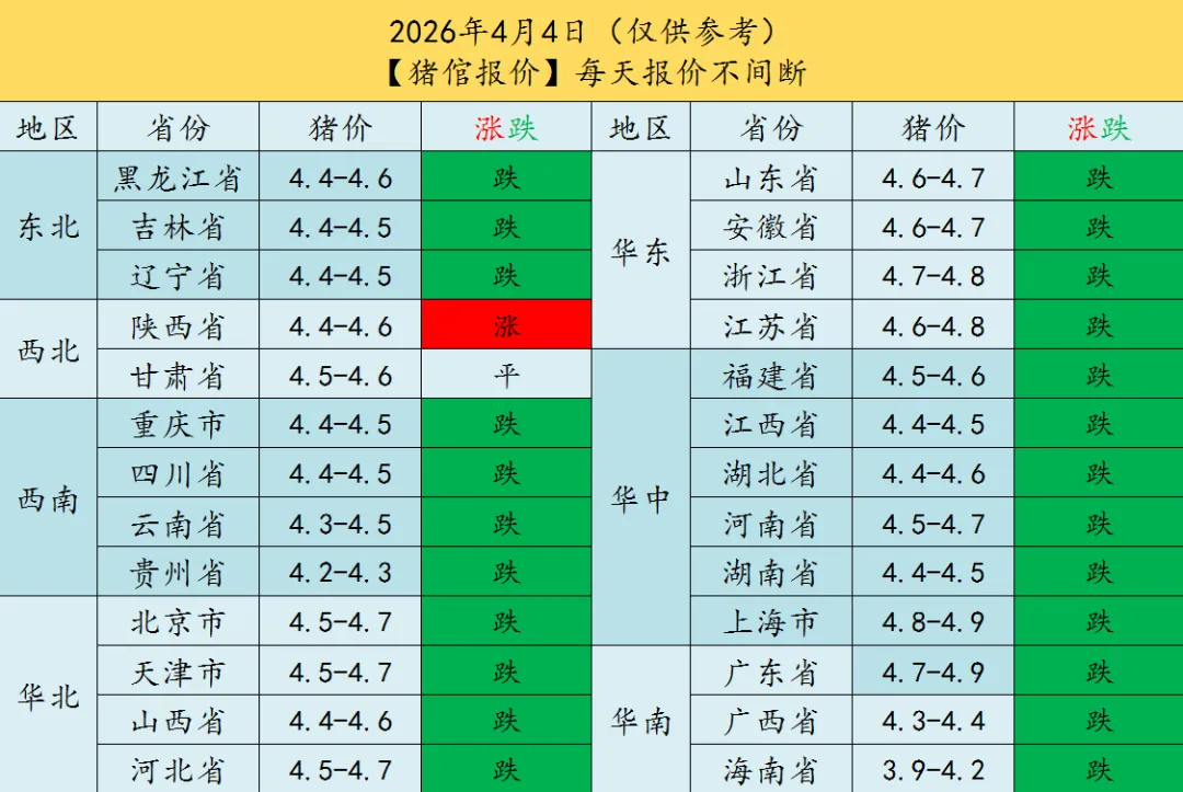 【猪倌报价】2026年4月4日|明日猪价 养羊网 2026-04-03 【猪倌报价】2026年4月4日|明日猪价 养羊网 2026-04-03 上一篇:2026.04.04-明天猪价(万绿丛中一点红!) 下一篇:【超前猪价 预测】4月5日~4月8日!全国猪价!!!!?! 您可能还会对下面的文章感兴趣111: 相关文章 近期价格更新!!! 【猪价预测】2月7-2月9日 猪价预测 乡下自家养的土鸡蛋,1.8一个到底贵不贵 (3月05日)最新鸡蛋价格预报!更新中