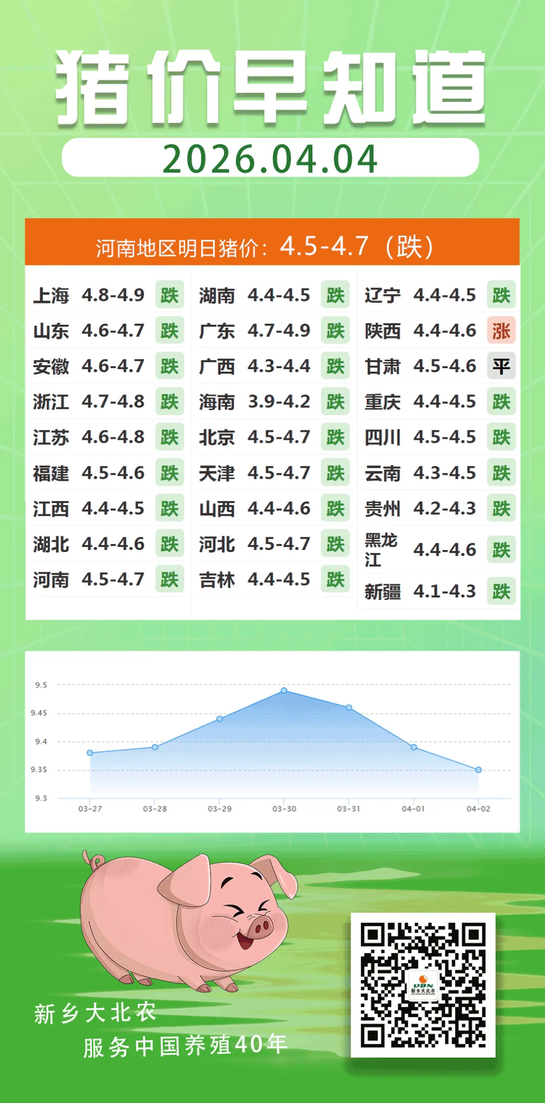 2026.04.04日猪价(河南跌) 养羊网 2026-04-03 2026.04.04日猪价(河南跌)SOON点击蓝字 关注我们猪价信息来源网络 仅供参考(侵立删) 养羊网 2026-04-03 上一篇:【超前猪价 预测】4月5日~4月8日!全国猪价!!!!?! 下一篇:【明日猪价】4月4日(太疯狂了!猪价全部跌成白菜价!!全国猪价最新报价!) 您可能还会对下面的文章感兴趣111: 相关文章 猪价回调加剧,唯海南独稳,!明天(2026.1.22)全国猪价涨跌表 河南·南阳硕宝合作社鸡蛋价格[2026年1月5日] 2025年4月13日全国各地生猪价格信息 “无抗”“有机”营销套路