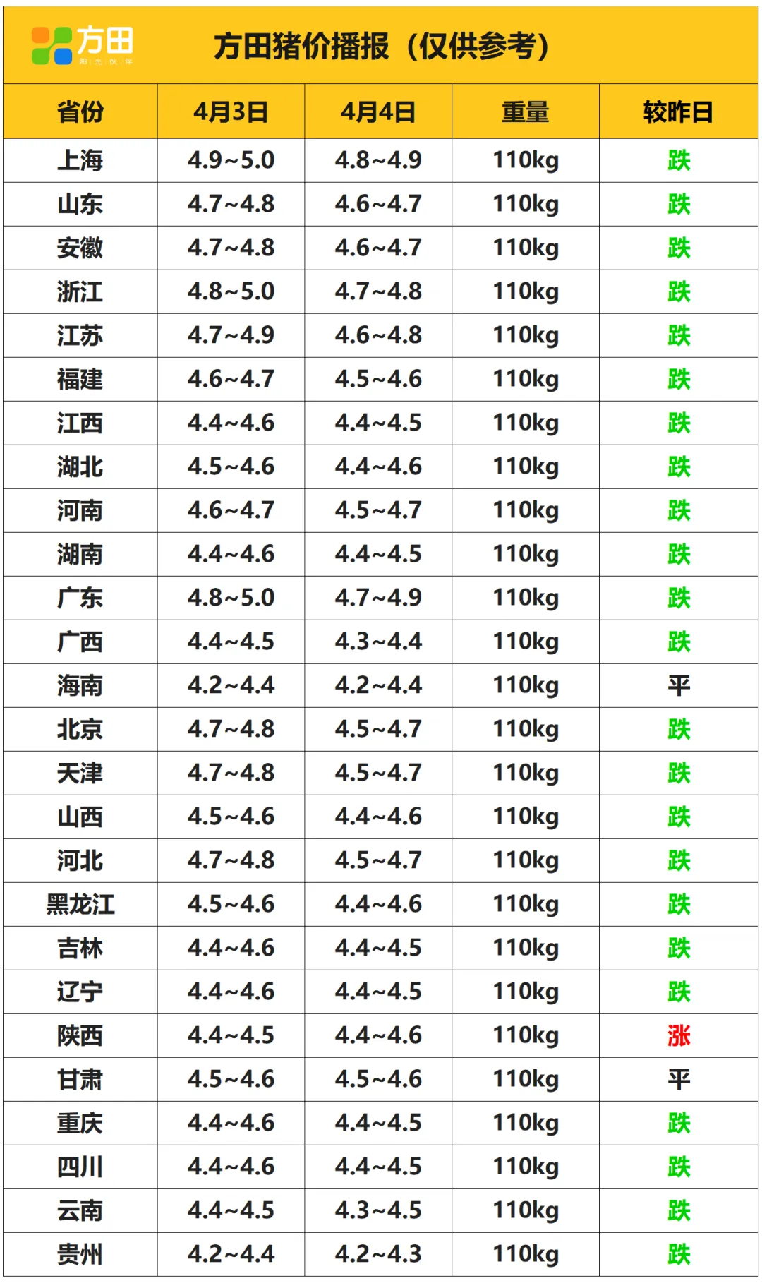 猪价丨4月4日 明日猪价早知道 养羊网 2026-04-03 猪价丨4月4日 明日猪价早知道 养羊网 2026-04-03 上一篇:明日猪价-2026年4月4日 下一篇:2026 . 04.04 猪价 您可能还会对下面的文章感兴趣111: 相关文章 近期价格更新!!! 【黑龙江吉粮农牧】2026年3月26日猪价早知道 鸭绒都50多万一吨,一件卖200块,可能吗? 2025年4月13日全国各地生猪价格信息