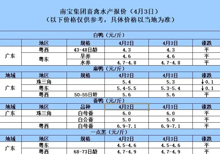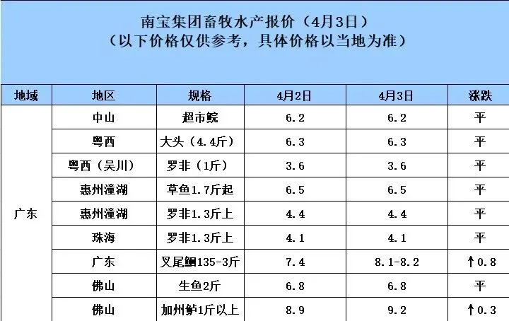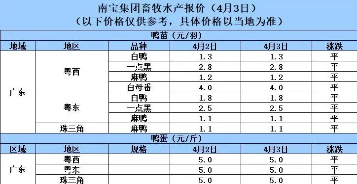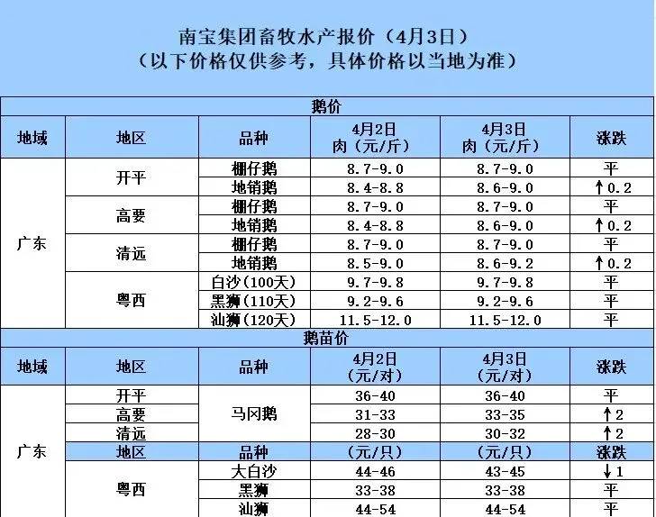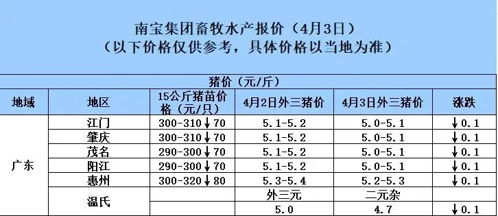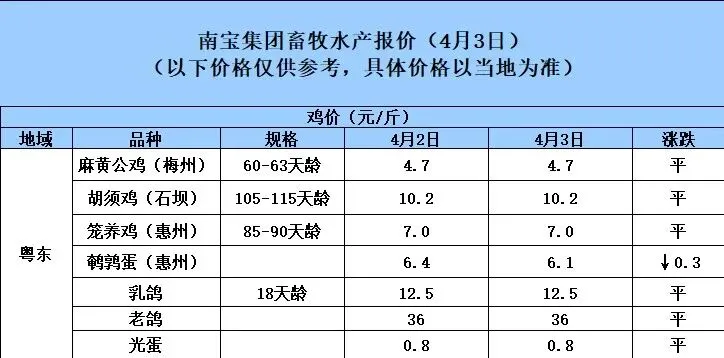 4月3日广东地区猪价持续小幅下跌 养羊网 2026-04-03 4月3日广东地区猪价持续小幅下跌荟宝饲料,畜禽水产创新者。以上数据来源于广东南宝集团有限公司 养羊网 2026-04-03 上一篇:最近有个话题叫做,20年没见过9元的猪价! 下一篇:鸡蛋价格一览|2026年4月4日鸡蛋价格(明日早知道) 您可能还会对下面的文章感兴趣111: 相关文章 黄牛养殖场 2025年4月13日全国各地生猪价格信息 近期价格更新!!! 【迈腾猪价】每日行情