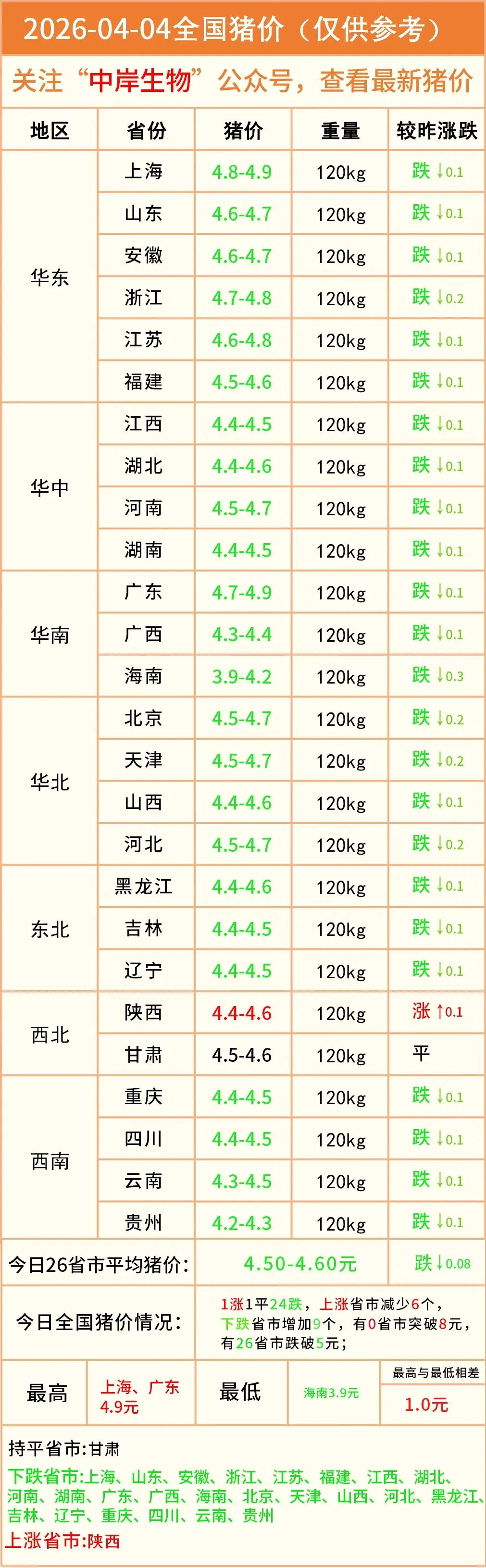 明日猪价|2026-04-04全国最新猪价(猪价已更新!) 养羊网 2026-04-03 明日猪价|2026-04-04全国最新猪价(猪价已更新!)营销中心丨0731-83806009技术服务丨0731-83806019 养羊网 2026-04-03 上一篇:【鸡蛋价格】2026.4.4--明日蛋价 下一篇:猪价 “跌跌不休” 行业深陷寒冬 国家收储托市盼回暖 您可能还会对下面的文章感兴趣111: 相关文章 2025年4月13日全国各地生猪价格信息 猪价大预测】1月14~1月16日!全国猪价大 2026.2.16 明日猪价 动物医学学生的养殖场生活