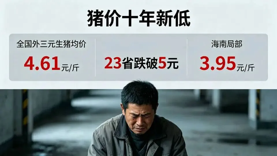 家人们,今天(4月3日)养猪圈炸锅了——猪价再创十年新低,全国外三元生猪均价仅4.61元/斤,23省跌破5元,海南局部甚至跌到3.95元/斤[4]。更惨的是,自繁自养成本高达6.5-7元/斤,卖一头亏400-500元,全行业陷入深度亏损。
