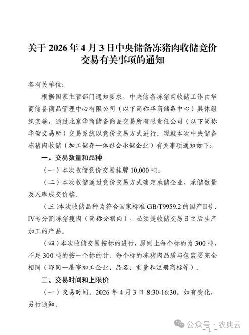 4月1日,华储网发布通知,4月3日将进行中央储备冻猪肉轮换收储交易,本次收储挂牌竞价交易1万吨。