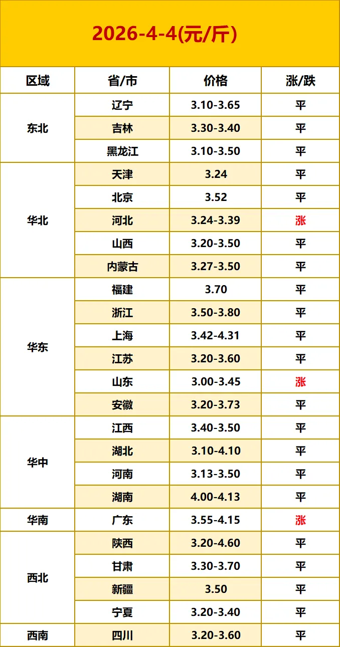 2026.4.4 今日鸡蛋价格 养羊网 2026-04-04 2026.4.4 今日鸡蛋价格蛋价日评:今日鸡蛋价格稳定。清明备货进入尾声,终端需求转淡,叠加在产蛋鸡存栏偏高、供应充足,市场整体承压,但饲料成本对蛋价形成一定底部支撑,预计节前蛋价稳中整理。以上报价仅供参考! 养羊网 2026-04-04 上一篇:2026年4月4日 川渝鸡蛋价格参考! 下一篇:2026年4月4日鸡蛋出仓价格 您可能还会对下面的文章感兴趣111: 相关文章 近期价格更新!!! 2026.2.26鸡蛋价格早报 利用发酵床养殖带来的好处 2025年4月13日全国各地生猪价格信息