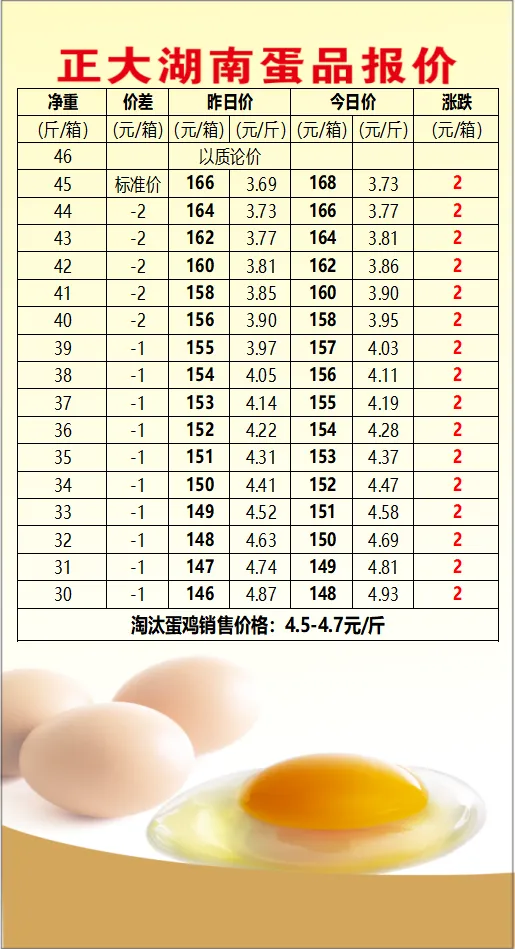 2026年4月4日正大湖南鸡蛋价格行情 养羊网 2026-04-04 2026年4月4日正大湖南鸡蛋价格行情合作请联系我们?了解最新蛋价行情,请关注正大湖南蛋品报价平台。 养羊网 2026-04-04 上一篇:明日猪价 | 2026.4.5日~全国各地最新猪价(猪价已更新!) 下一篇:《湖北荆门》褐壳鸡蛋价格2026年4月4日 您可能还会对下面的文章感兴趣111: 相关文章 【超前猪价大预测】3月13~3月15日全国猪价预测 ! 猪价有可能崩吗? 2026.2.4明日全国最新猪价信息(猪价有变!个别飘红!) 2025年4月13日全国各地生猪价格信息 2025年4月13日全国各地生猪价格信息
