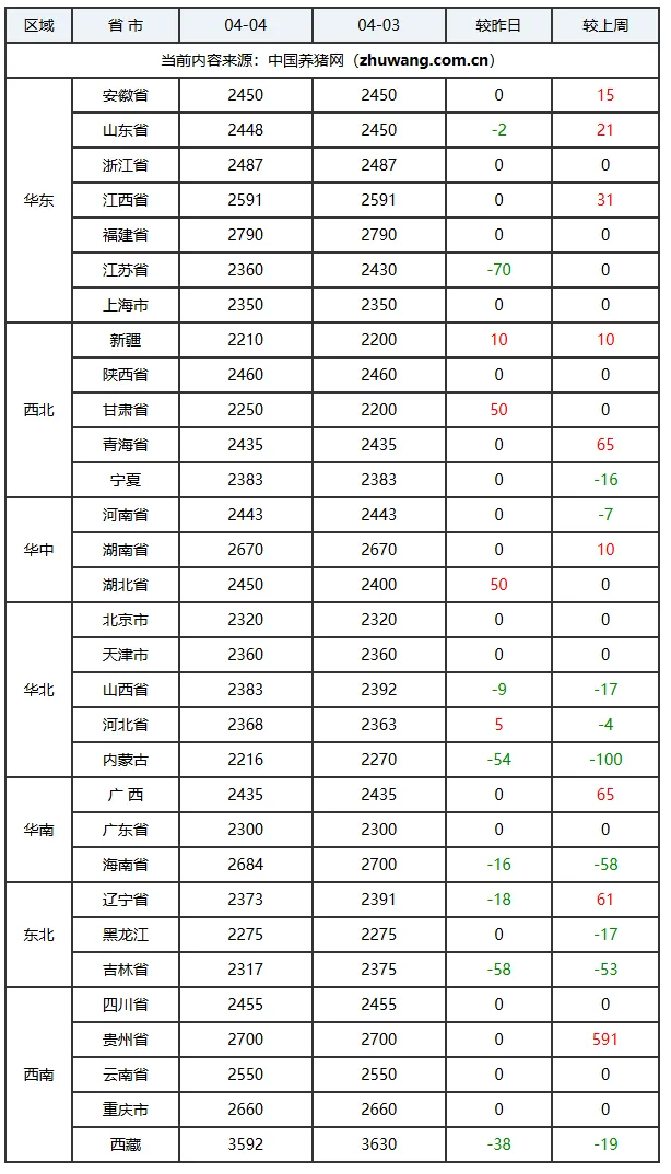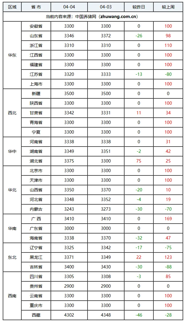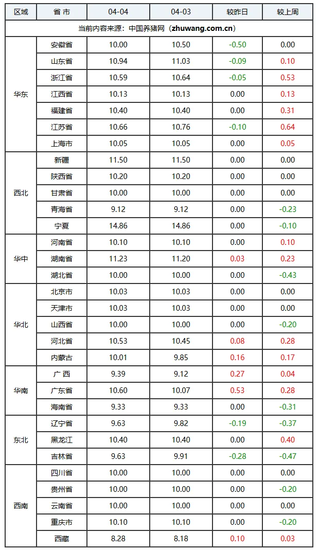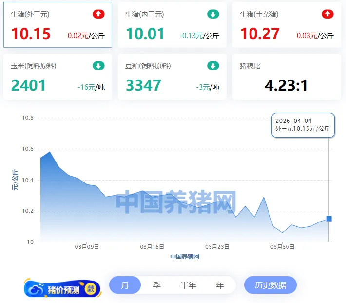 猪价系统 往期回顾 ? ?【猪价日报】2026年4月3日 小幅上涨!均价10.13元 8省上涨 ? ?【猪价日报】2026年4月2日 止跌回升!均价10.10元 7省上涨 ? ?【猪价日报】2026年4月1日 均价10.09元 多数省份持稳 【版权声明】中国养猪网旗下所平台转载的文章均已注明来源、中国养猪网原创文章其他平台转载需注明来源、中国养猪网特别说明的文章未经允许不可转载,感谢您的支持与配合;我们所有刊登的文章仅供养猪人参考学习,若有不妥,请及时联系我们,添加官方微信号“zgyangzhuwang”
