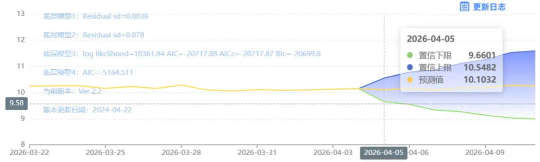 玄田算法是由项目课题组团队原创的非经典逻辑数值聚合理论和不确定性预测方法,构建了基于一致模算子的生猪价格预测模型。该模型采用的聚合函数及一致模相关理论与方法已获得多项国家自然科学基金和省级自然科学资金资助,并获得多项省级自然科学奖奖项。04月05日预测猪价为10.1032,置信区间在9.6601--10.5482之间。04月06日预测猪价为10.1619;04月07日预测猪价为10.0924。