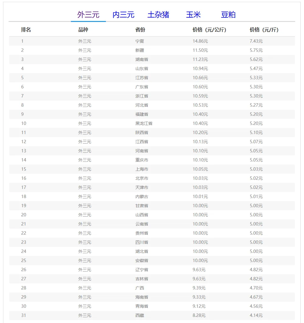 外三元排行前三:宁夏回族自治区14.86元/公斤、新疆维吾尔自治区11.50元/公斤、湖南省11.23元/公斤;