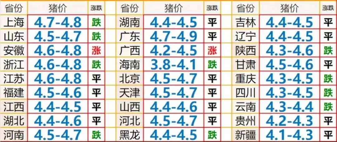 4.5全国猪价行情汇总只供参考 养羊网 2026-04-04 4.5全国猪价行情汇总只供参考 养羊网 2026-04-04 上一篇:猪价跌破5元,中小散户喊难?错了!“养猪大户”才是的“纸老虎” 下一篇:【明日猪价】4月5日(太疯狂了!猪价大反转!全国猪价最新报价!) 您可能还会对下面的文章感兴趣111: 相关文章 2026 . 4 . 3 鸡蛋价格 内蒙羊都不明码标价的吗? 2025年4月13日全国各地生猪价格信息 2025年4月13日全国各地生猪价格信息