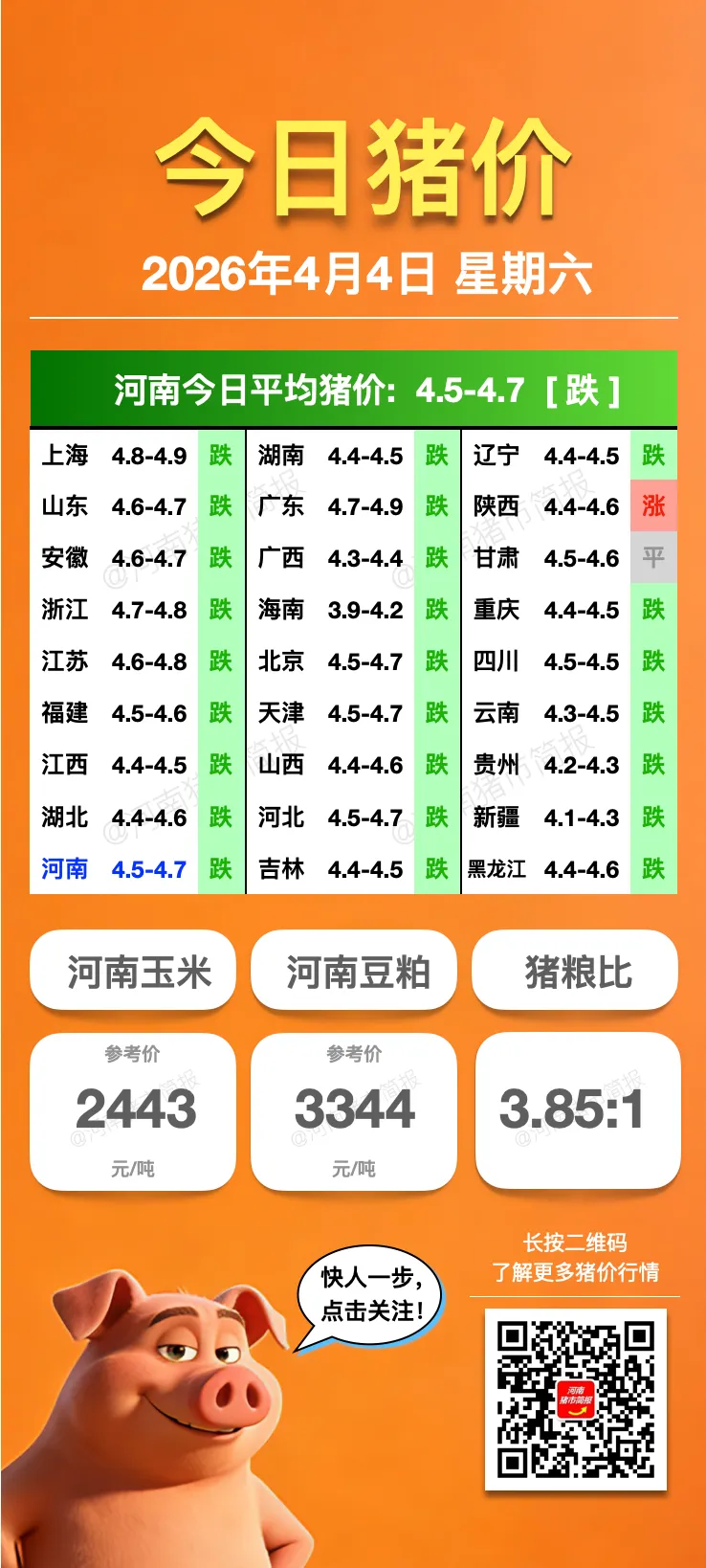 河南猪价跌势不减!全国普跌!2026.04.04-今日猪价