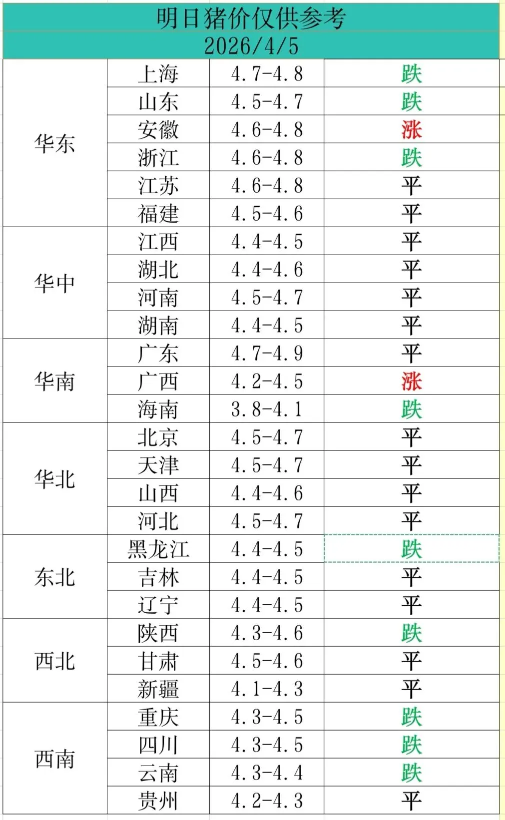 2026年4月5日全国猪价信息/供大家参考 养羊网 2026-04-04 2026年4月5日全国猪价信息/供大家参考 养羊网 2026-04-04 上一篇:2026.4.4全国鸡蛋价格行情汇总! 下一篇:【猪价大预测】2026年4月6日~4月8日!全国猪价走势分析 您可能还会对下面的文章感兴趣111: 相关文章 猪价波动行情2026.3.29全国猪价 2025年4月13日全国各地生猪价格信息 多省猪价上涨!2026年2月27日多省猪价反弹上涨!! 近期价格更新!!!