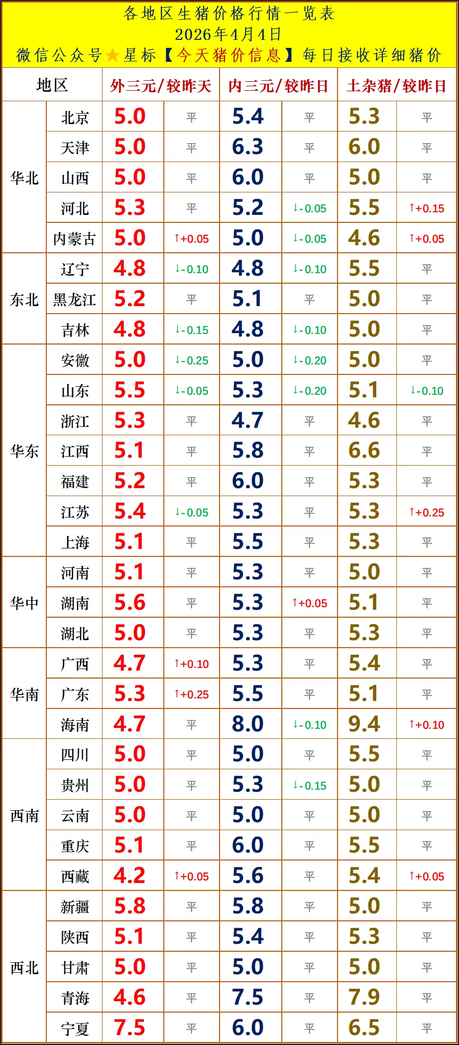 今日猪价 | 2026.4.5明天猪价最新信息!2026年04月04日猪价行情: 外三元:5.07元/斤,较昨日上涨0.01元 内三元:5.00元/斤,较昨日下跌0.06元 土杂猪:5.18元/斤,较昨日上涨0.01元