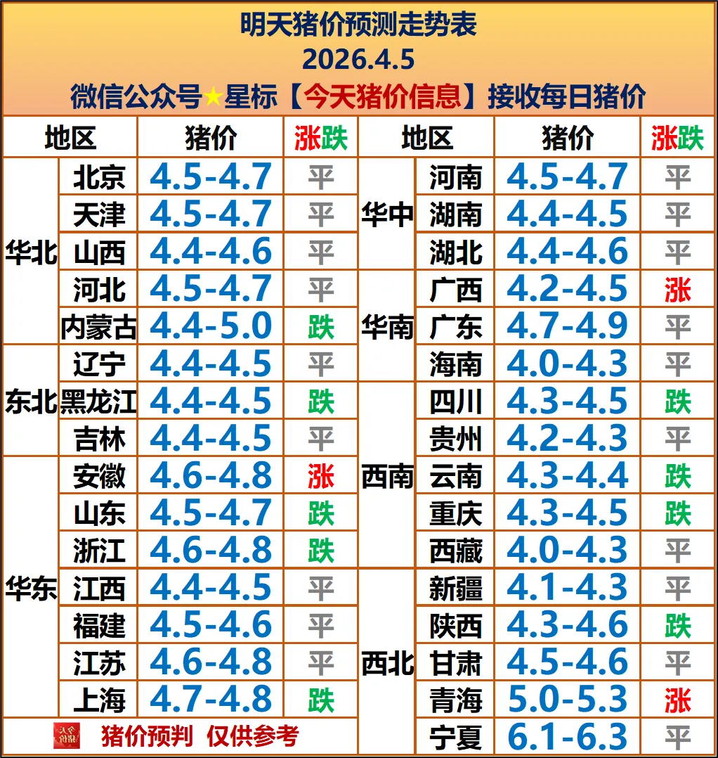 明天4月5日全国外三元生猪均价维持在 9.0-9.1 元 / 公斤,整体延续弱稳态势,局部小幅下跌。北方产区多以横盘调整为主,报价 4.4-4.6 元 / 斤。短期猪价难有明显反弹,大概率保持低位震荡运行,出栏可顺势操作。