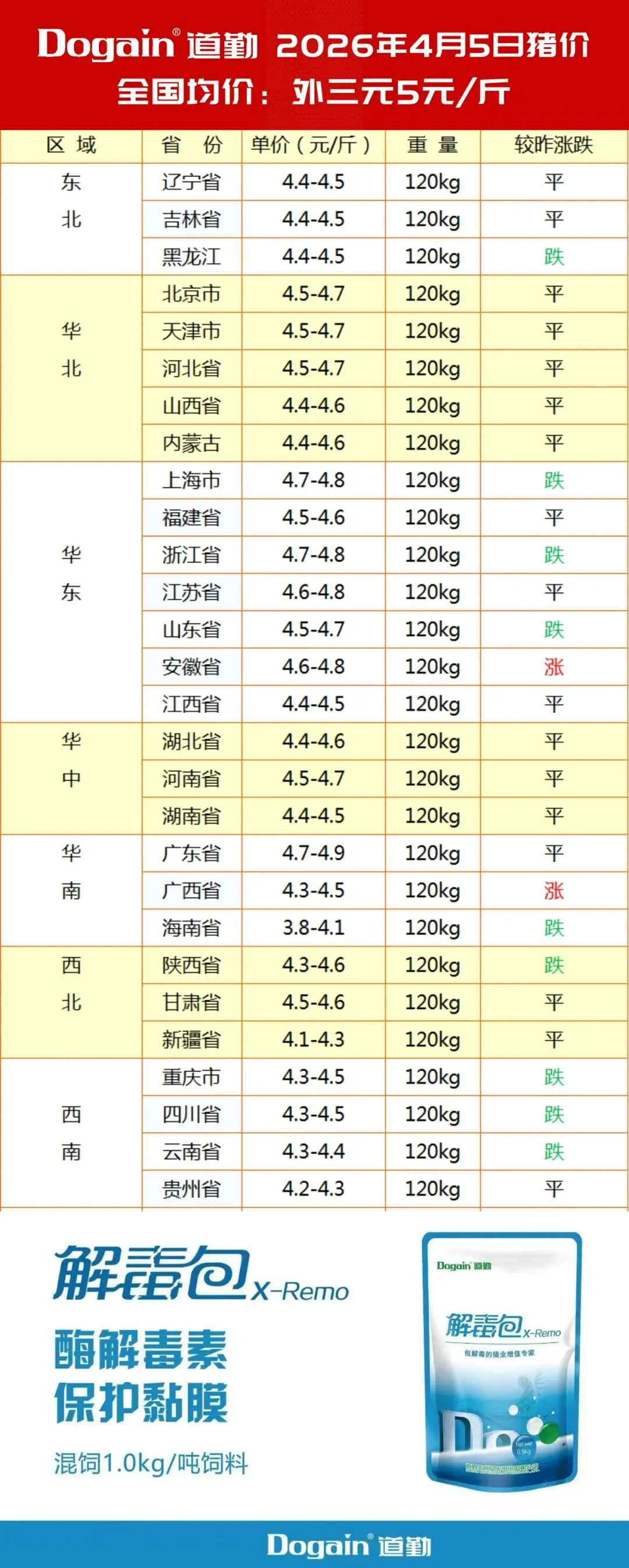 4月5日,猪价信息 养羊网 2026-04-04 4月5日,猪价信息 养羊网 2026-04-04 上一篇:猪价“跳水”,猪周期何时触底反弹? 下一篇:官方重启收储,9元猪价或是"最后一跌" 您可能还会对下面的文章感兴趣111: 相关文章 猪价低迷的反思 【行业动态】猪价刷新十年新低 养殖亏损加剧产能去化 清明备货行情分析 第39篇:什么是【猪周期】? 2026.01.27-今日猪价